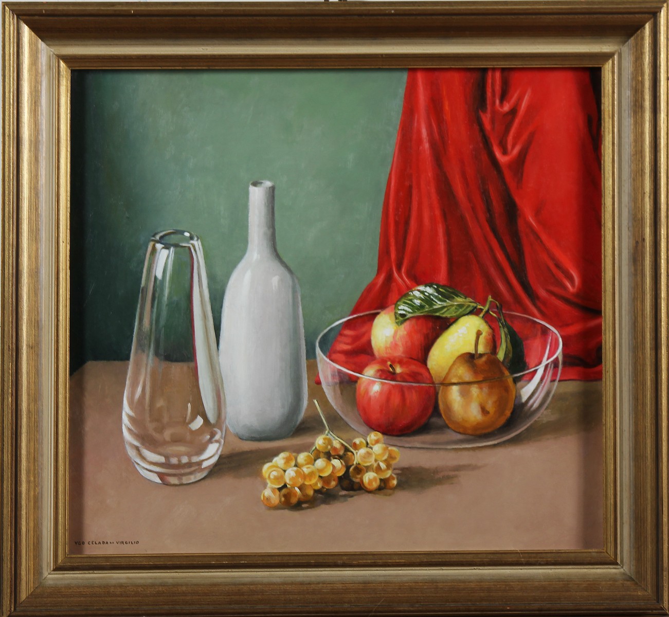 CELADA DA VIRGILIO UGO (1895 - 1995) Natura morta con uva, mele e bottiglia. Olio su tavola. Cm 58,50 x 53,00. Firma in basso a sinistra. Cornice presente