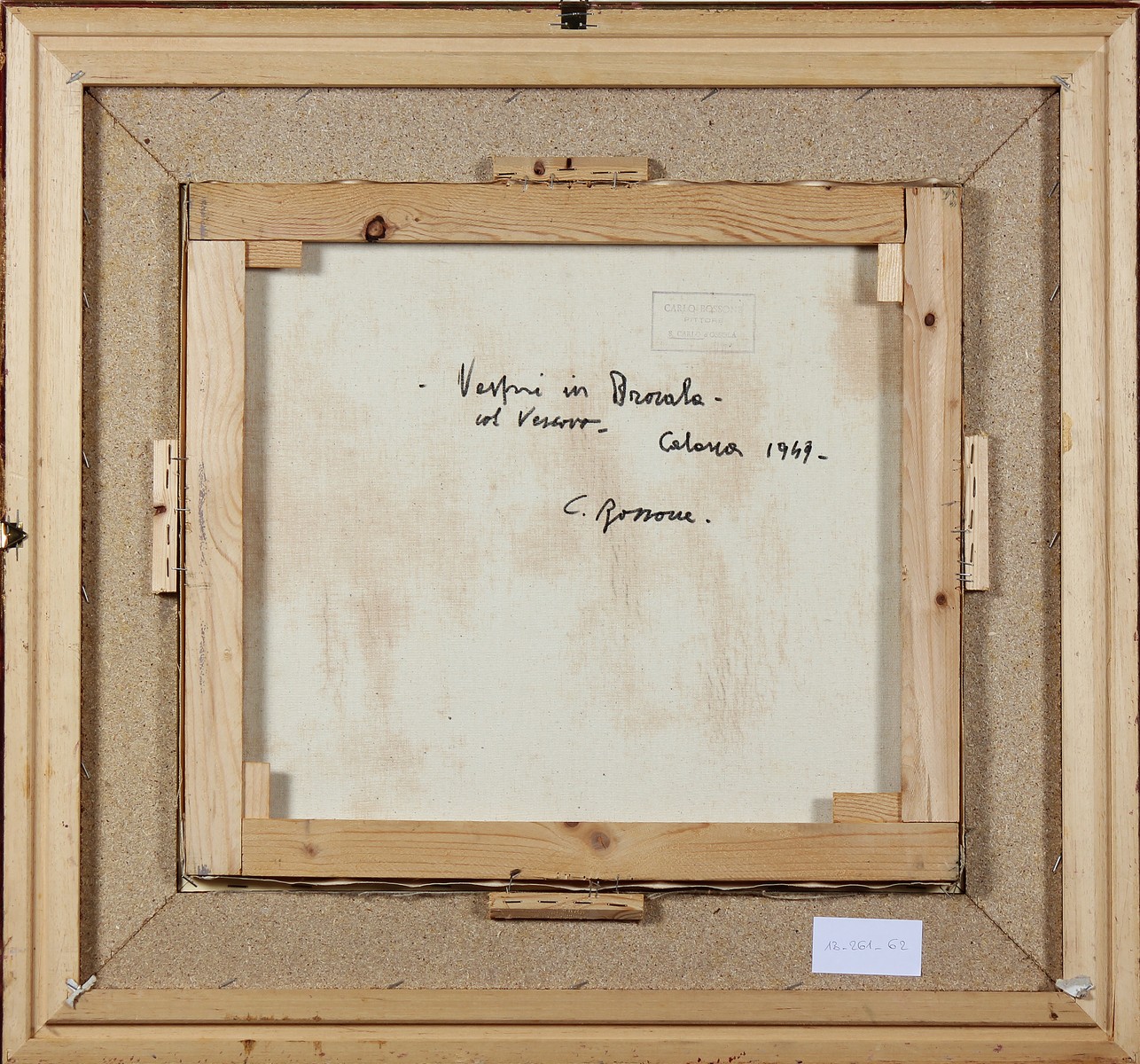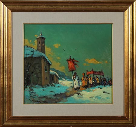 BOSSONE CARLO (1904 - 1991) Vespri. 1949. Olio su tela . Cm 50,00 x 45,50. Firma e data in basso a sinistra. Al retro firma, titolo, data e timbro dell'artista. Cornice presente