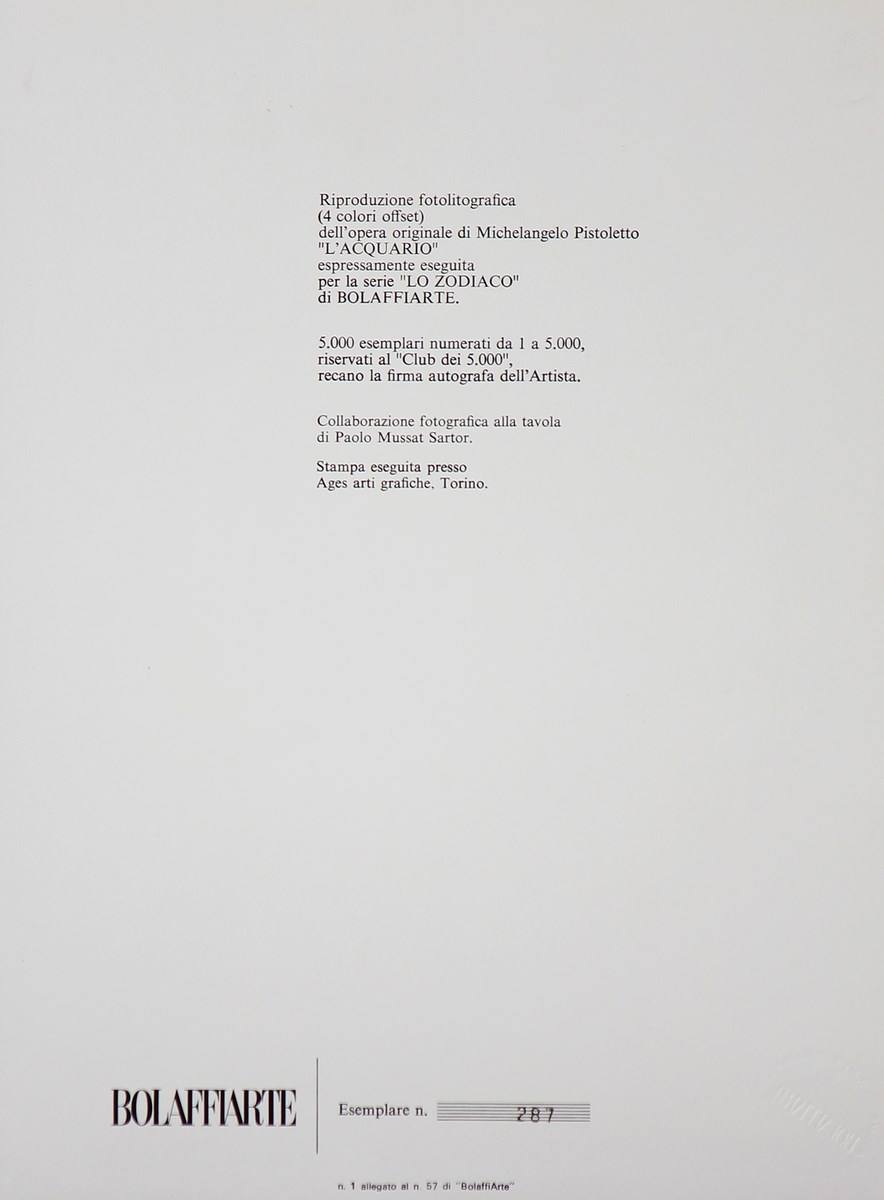 PISTOLETTO MICHELANGELO (n. 1933) L'acquario. 1976. Fotolitografia. Cm 21,00 x 28,00. 287/5000. Firma in basso a biro. Tiratura al retro. In basso a sinistra timbro a secco Bolaffi Arte - Firma originale autografa dell'Artista. Riproduzione fotolitografica (4 colori offset) dell'opera originale di Michelangelo Pistoletto - L'acquario - espressamente eseguita per la serie - Lo Zodiaco - di BolaffiArte tirata in 5.000 esemplari numerati, riservati al - Club dei 5.000 - recanti la firma autografa dell'artista. L'opera veniva venduta come allegato al n.57 di BolaffiArte.