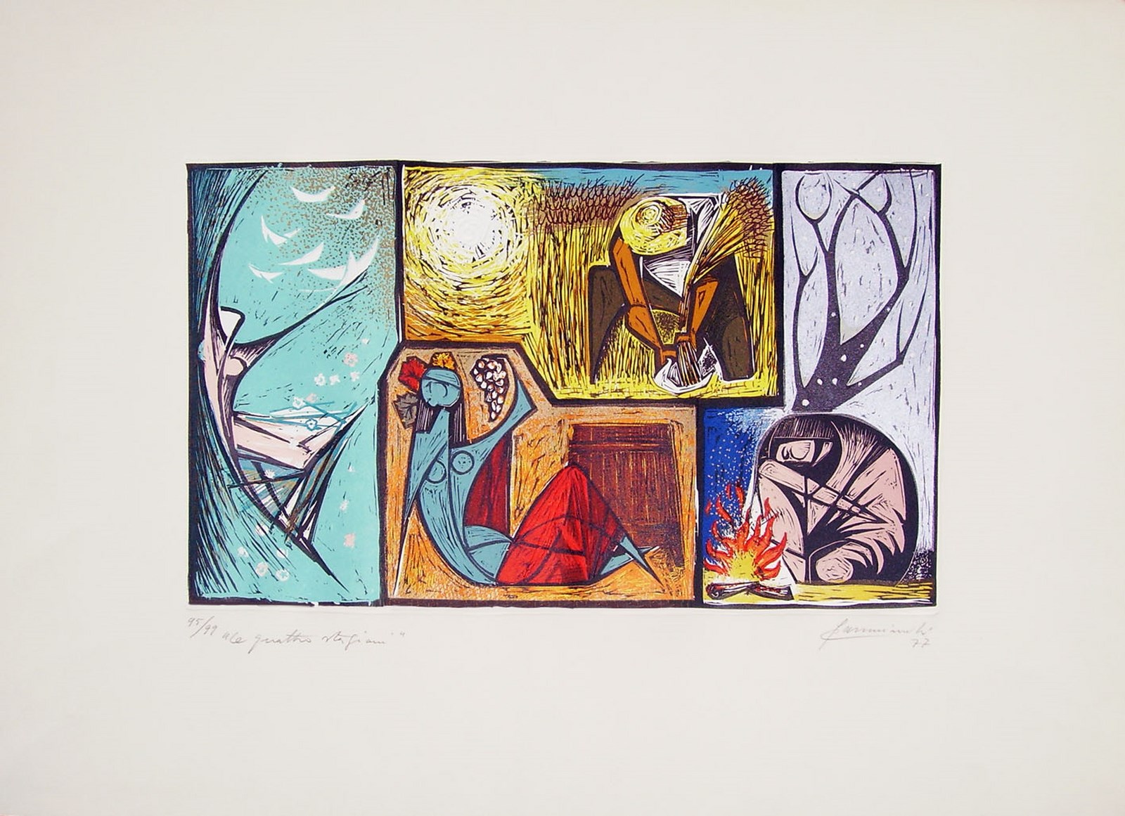 ANONIMO Le quattro stagioni. 1977. Litografia e rilievo a secco. Cm 70,00 x 50,00. Misure lastra: 25,5x43,3 cm.Tir. 95/99 e titolo in basso a sinistra a matita. Firma Carminati e anno in basso a destra a matita.