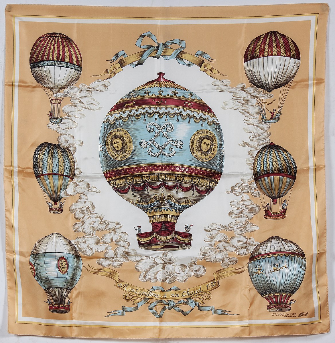 CANOVA ANDRE'-CLAUDE (n. 1948) Montgolfiere à air Chaud 1783. Seta. Cm 78,00 x 76,00. Foulard in seta, Concorde, Air France.