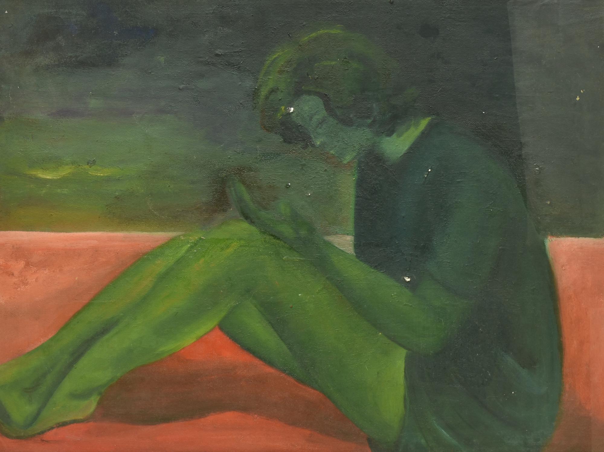 Anonimo DONNA VERDE SU FONDO ROSSO olio su masonite, 60x80 cm al retro:...