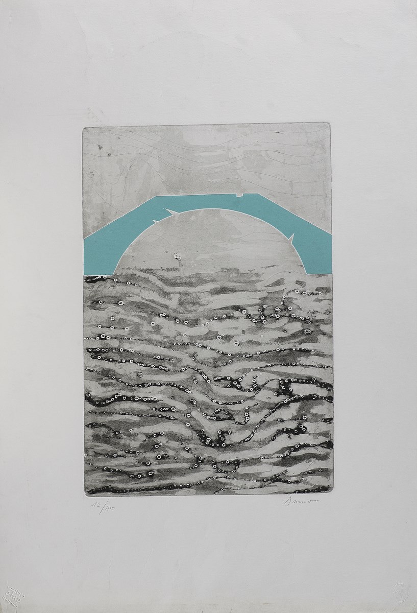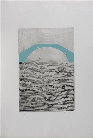 RAMOUS CARLO (1926 - 2003) Senza titolo. Litografia. Cm 50,00 x 70,00. Misure lastra: 41x28cm. Firma e tir. 12/100 in basso a matita. Timbro a secco Comitato aiap italiano in basso a sinistra.