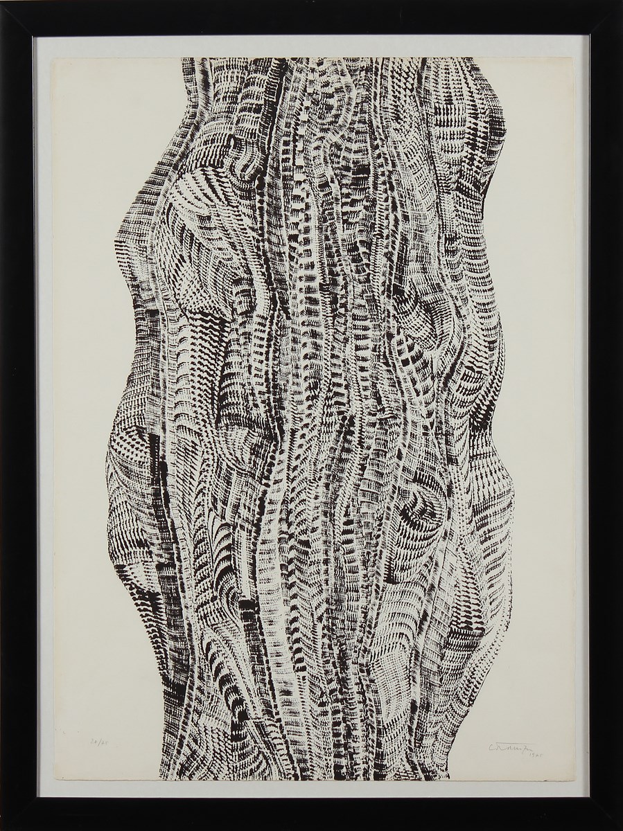 ANONIMO Senza titolo. 1975. Litografia. Cm 50,00 x 70,00. Misure disegno: 70x40 cm.Tir. 20/75, firma illeggibile e data in basso a matita. Cornice presente