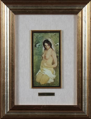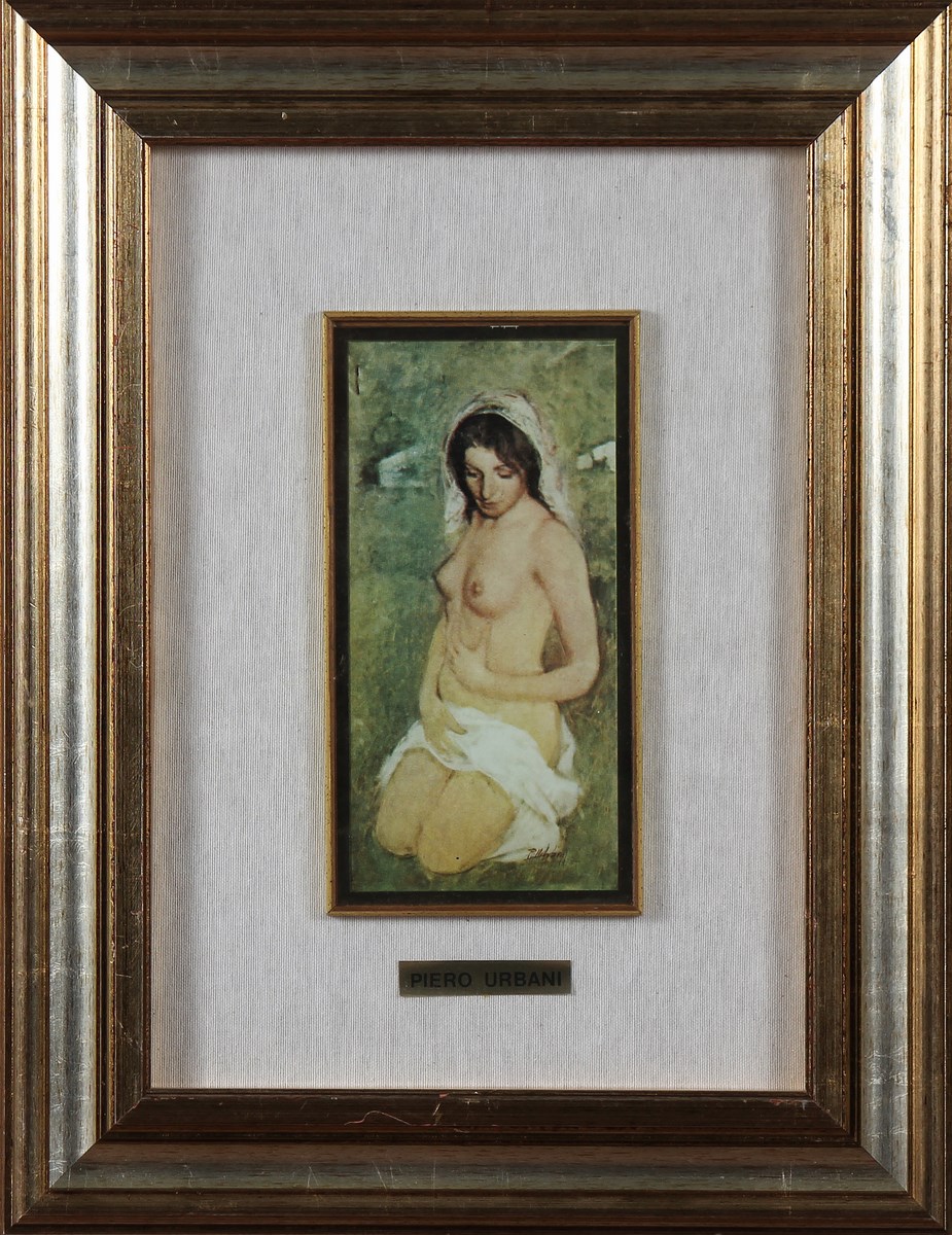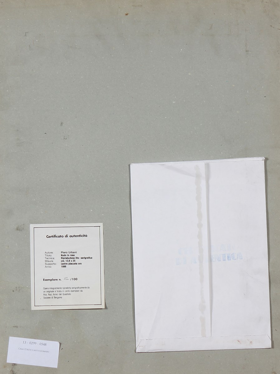 URBANI PIERO (1913 - 1992) Nudo in rosa. 1986. Composizione lito-serigrafica su lastra. Cm 12,80 x 25,00. Tir. 12/100. Firma serigrafata in basso a destra. Al retro certificato di autenticità a cura dell'Associazione nazionale amici del Quadrato. In allegato all'opera brochure descrittiva ed attestazione tecnico-peritale. Cornice presente