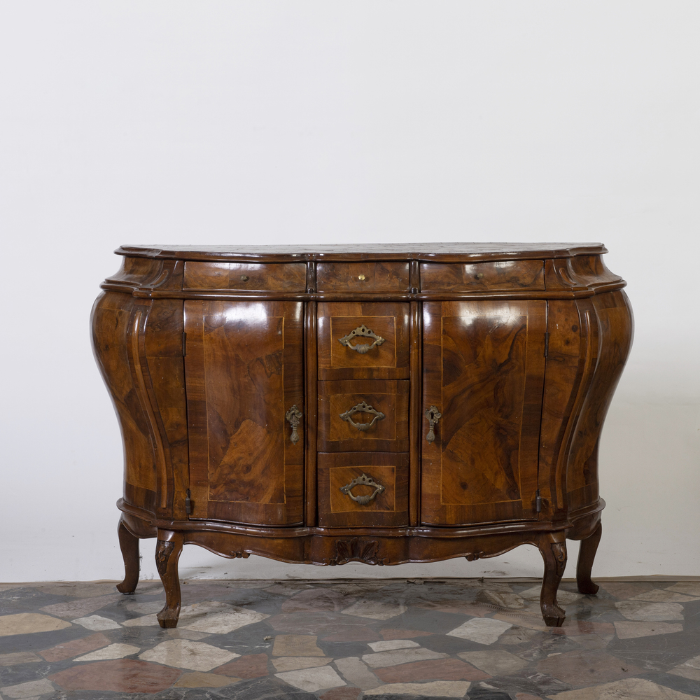 Credenza in noce con due ante e cassetti, fronte e fianchi mossi