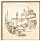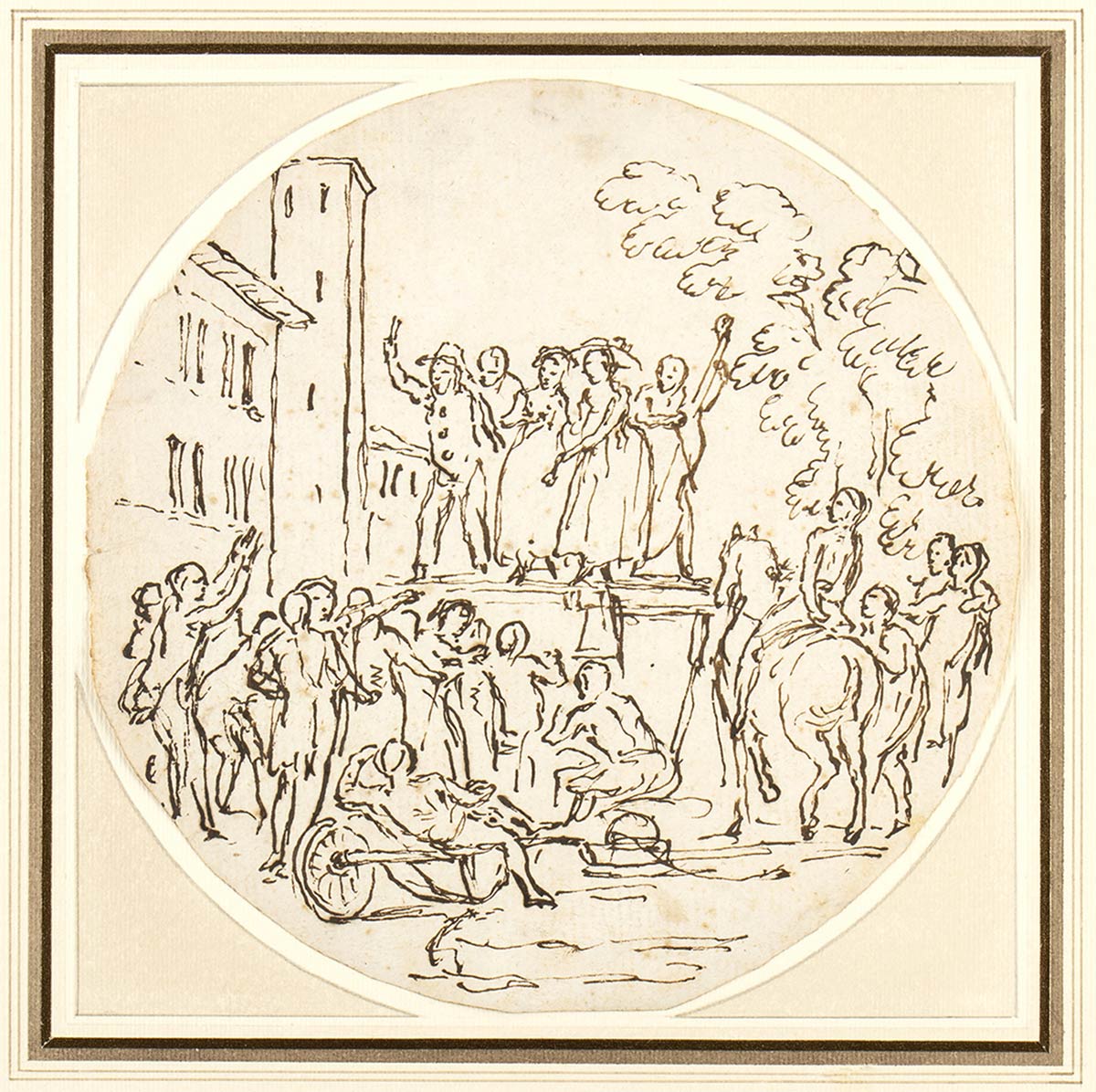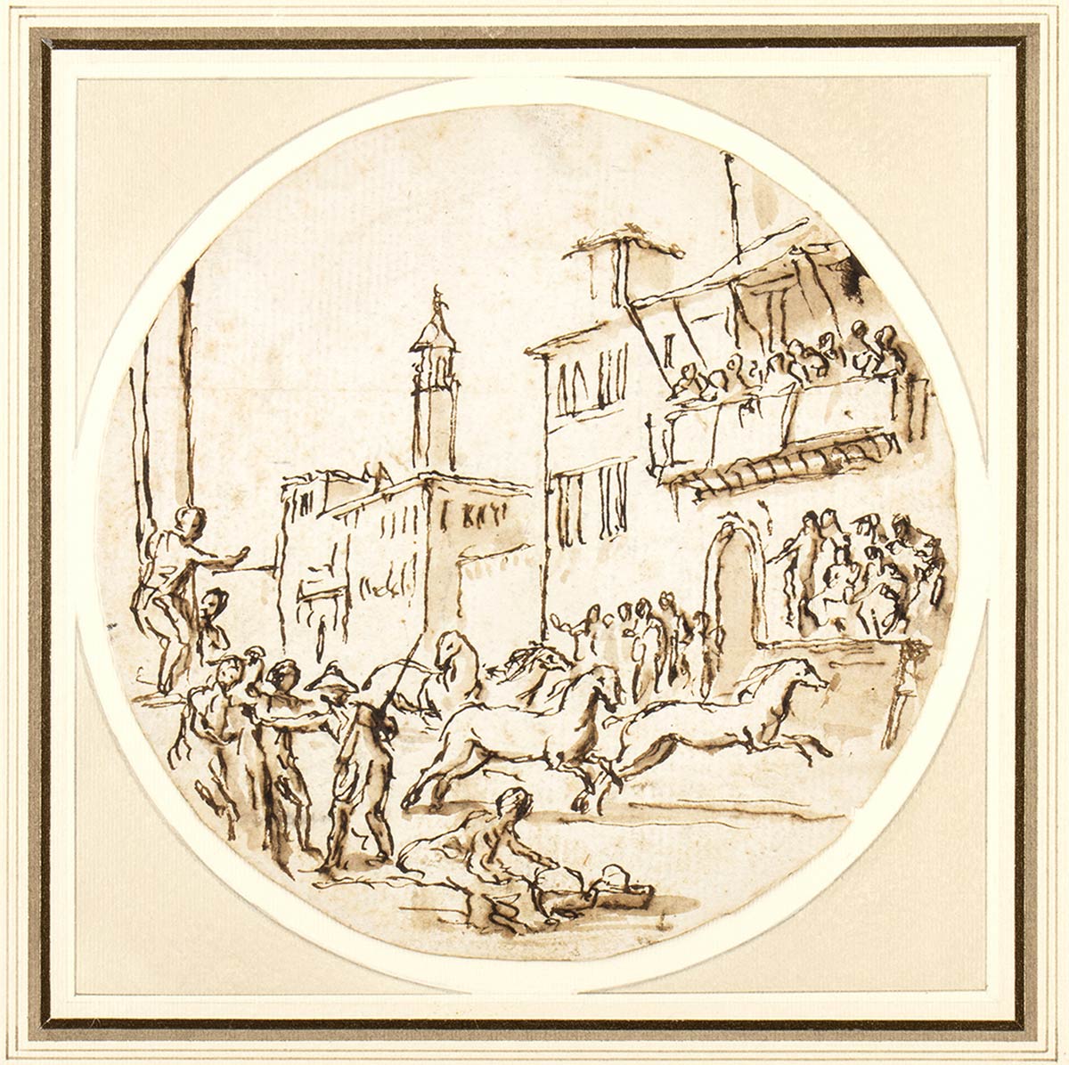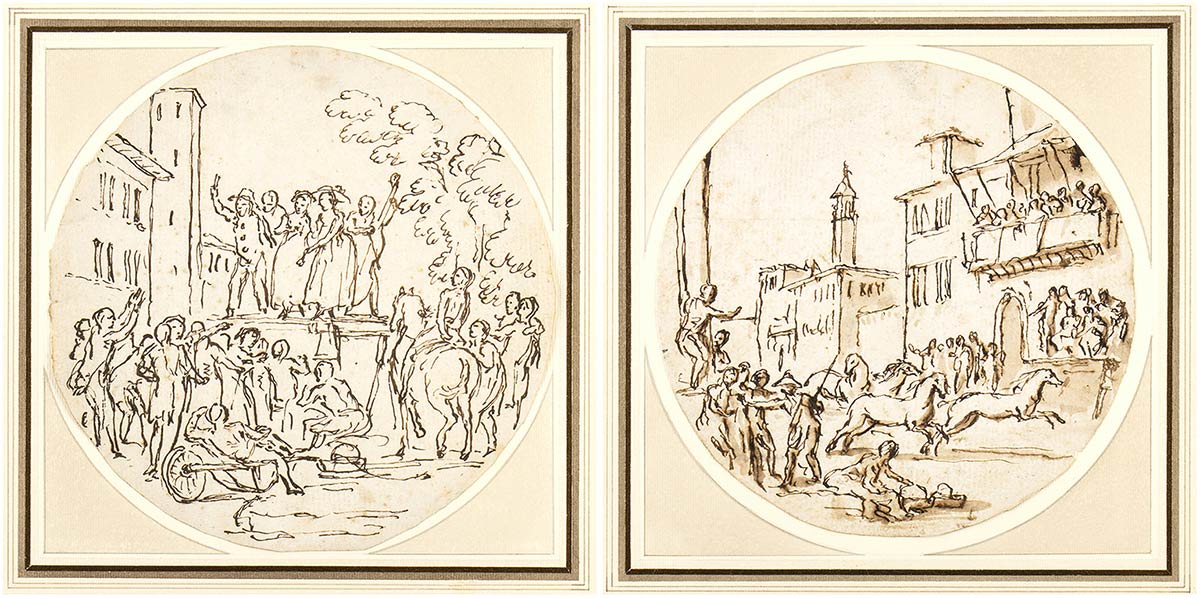 Coppia di disegni: a) Concertino nel parco; b) corsa di cavalli tra due ali di folla.