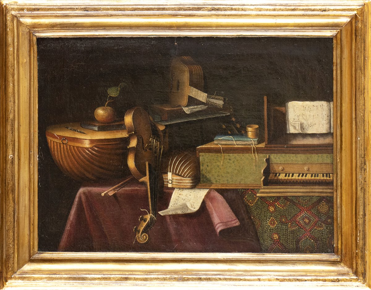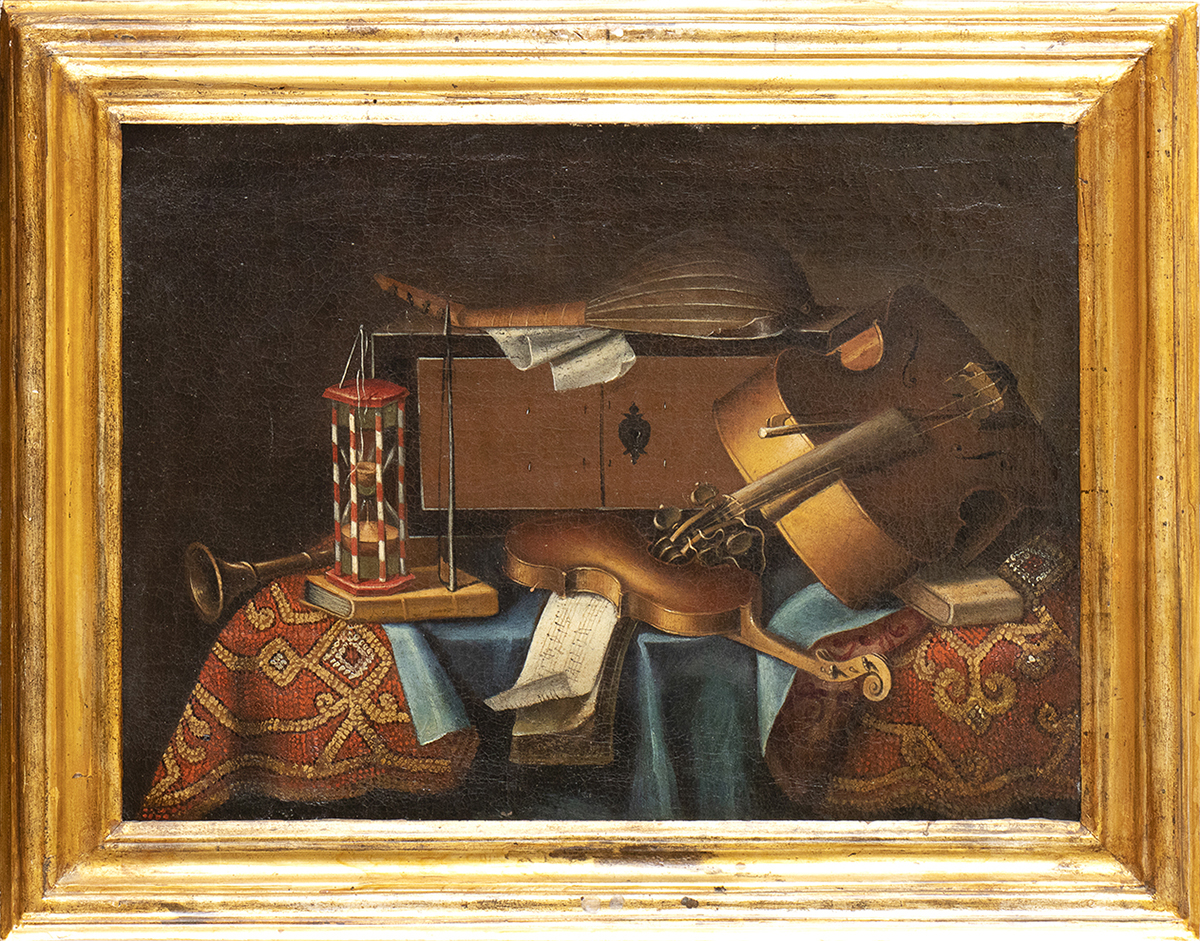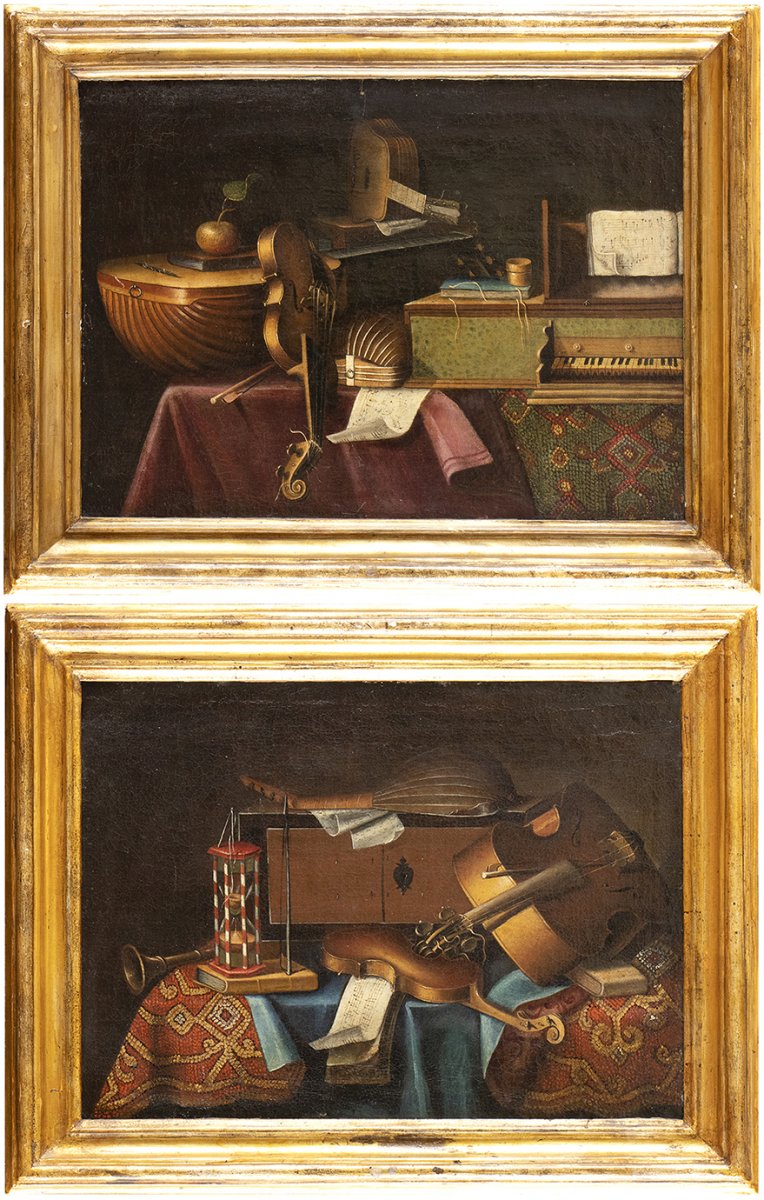 La presente coppia di dipinti è accompagnata dall'Attestato di Libera Circolazione. Questa bellissima coppia di natura morte di tema musicale si pone chiaramente sotto il raggio di influenza di Evaristo Baschenis, che condusse il genere ai suoi livelli più alti e metafisici nella pittura italiana del Seicento. Ritroviamo qui gran parte dei motivi che proprio le opere di Baschenis resero canoniche, combinando maestria prospettica, virtuosismo luministico, rigorosa monumentalità compositiva, lenticolare aderenza alle forme raffigurate, precisione organologica nella resa degli strumenti musicali. Gli stessi strumenti ci rimandano alle opere della cerchia di Baschenis: liuto, mandola, chitarra, violino, viola, spinetta, bombarda, accompagnati dall’inevitabile corredi di spartiti aperti, posti su leggio o brillantemente scorciati con sapienti effetti di trompe-l’oeil. Un’elegante e originale clessidra e un pomo sottolineano la presenza del tempo e il sottotesto di vanitas chiaramente impliciti in queste composizioni, per realizzare le quali Baschenis e i suoi più stretti seguaci - in primo luogo Bartolomeo Bettera, a cui le tele possono essere riferite - attingevano ad un repertorio di oggetti stabilmente disponibili presso l’atelier.