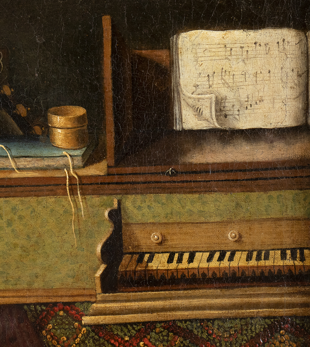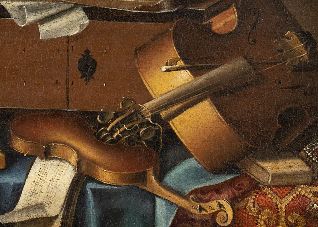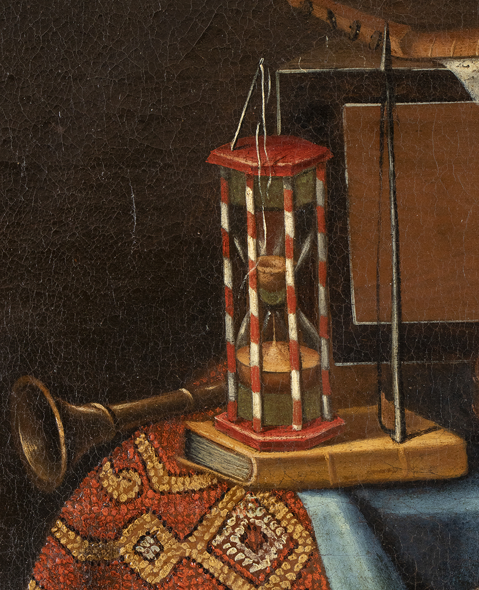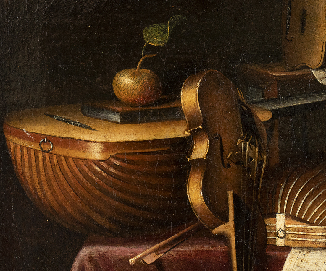 La presente coppia di dipinti è accompagnata dall'Attestato di Libera Circolazione. Questa bellissima coppia di natura morte di tema musicale si pone chiaramente sotto il raggio di influenza di Evaristo Baschenis, che condusse il genere ai suoi livelli più alti e metafisici nella pittura italiana del Seicento. Ritroviamo qui gran parte dei motivi che proprio le opere di Baschenis resero canoniche, combinando maestria prospettica, virtuosismo luministico, rigorosa monumentalità compositiva, lenticolare aderenza alle forme raffigurate, precisione organologica nella resa degli strumenti musicali. Gli stessi strumenti ci rimandano alle opere della cerchia di Baschenis: liuto, mandola, chitarra, violino, viola, spinetta, bombarda, accompagnati dall’inevitabile corredi di spartiti aperti, posti su leggio o brillantemente scorciati con sapienti effetti di trompe-l’oeil. Un’elegante e originale clessidra e un pomo sottolineano la presenza del tempo e il sottotesto di vanitas chiaramente impliciti in queste composizioni, per realizzare le quali Baschenis e i suoi più stretti seguaci - in primo luogo Bartolomeo Bettera, a cui le tele possono essere riferite - attingevano ad un repertorio di oggetti stabilmente disponibili presso l’atelier.