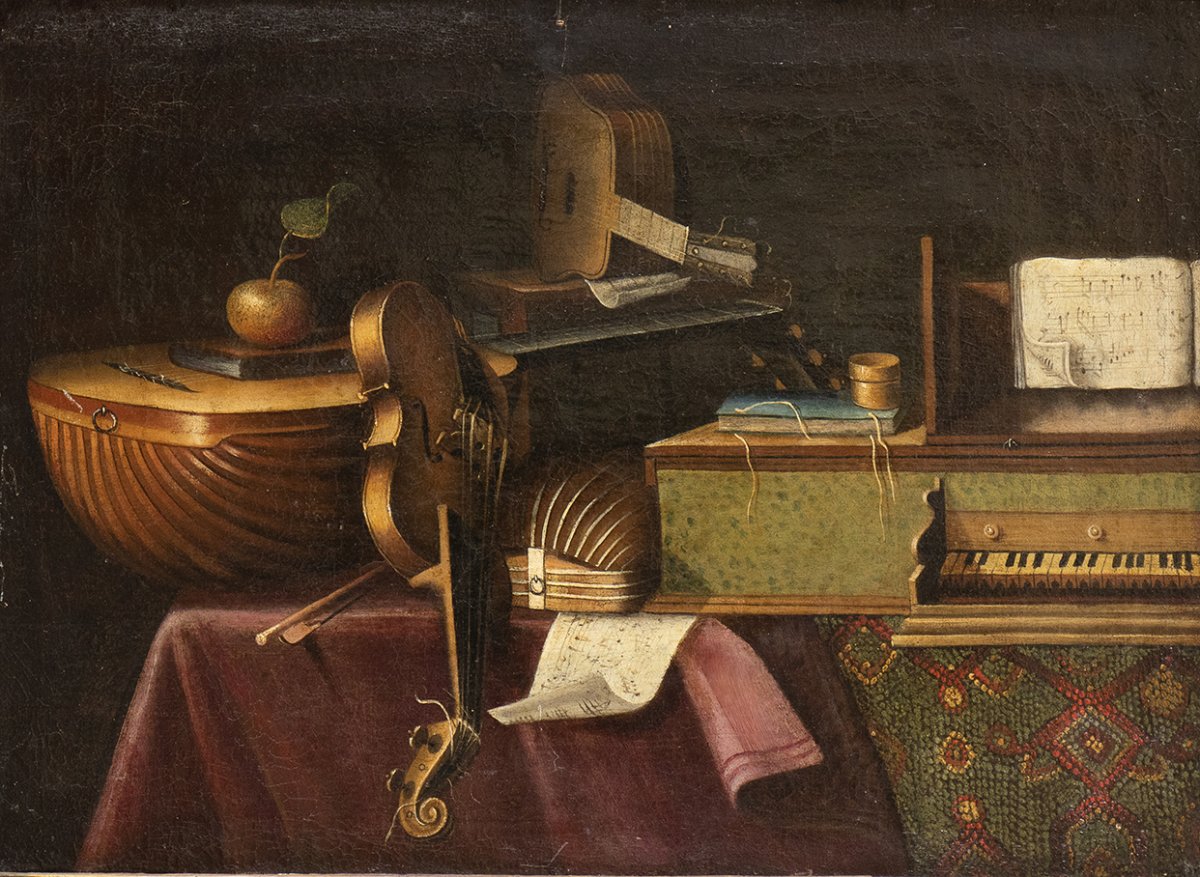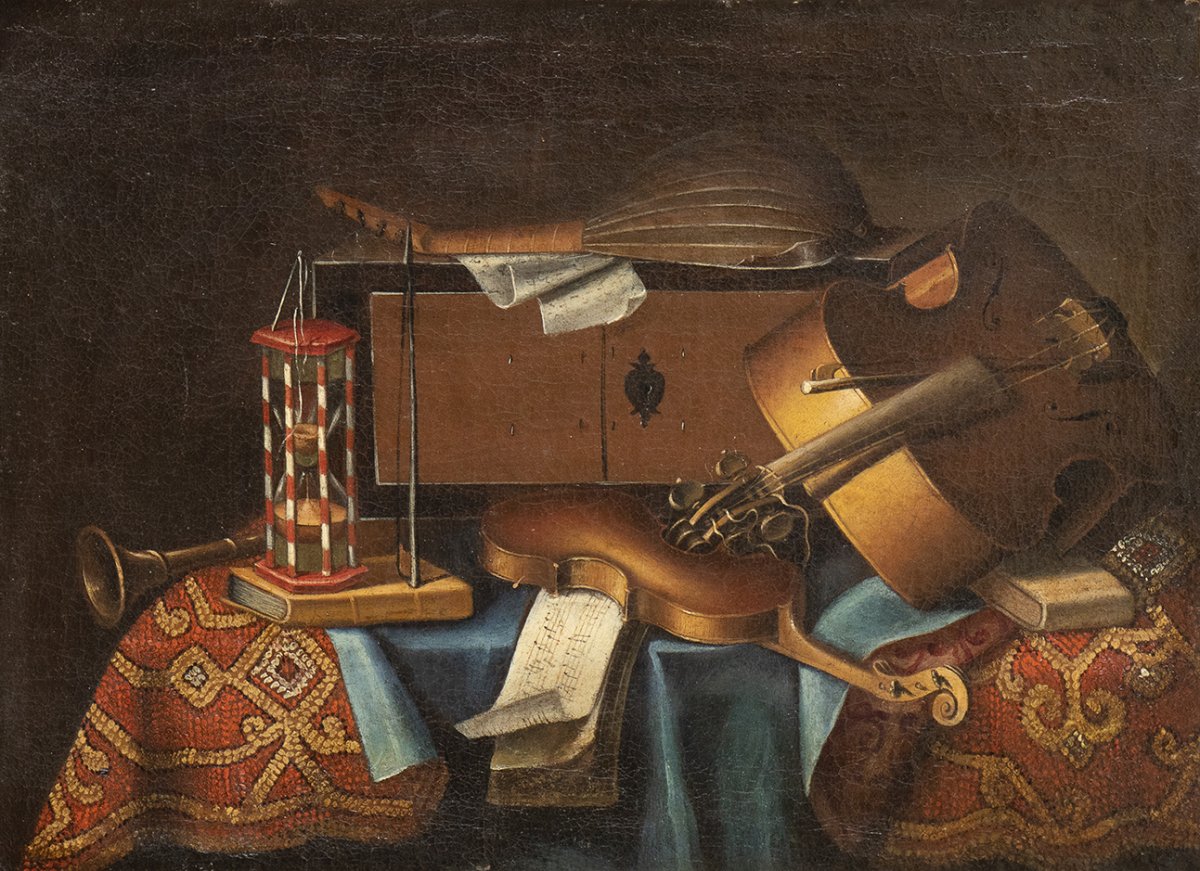 Coppia di dipinti:a) Natura morta con strumenti a corde, virginale, spartiti e pomo; b) natura morta con strumenti musicali, spartito e clessidra
