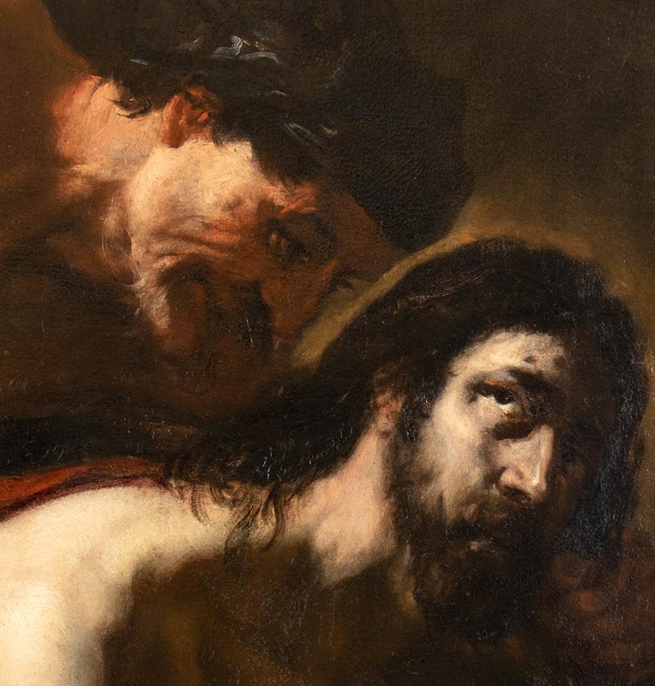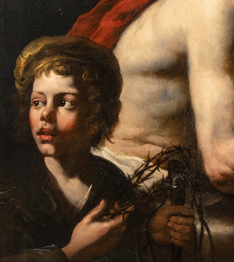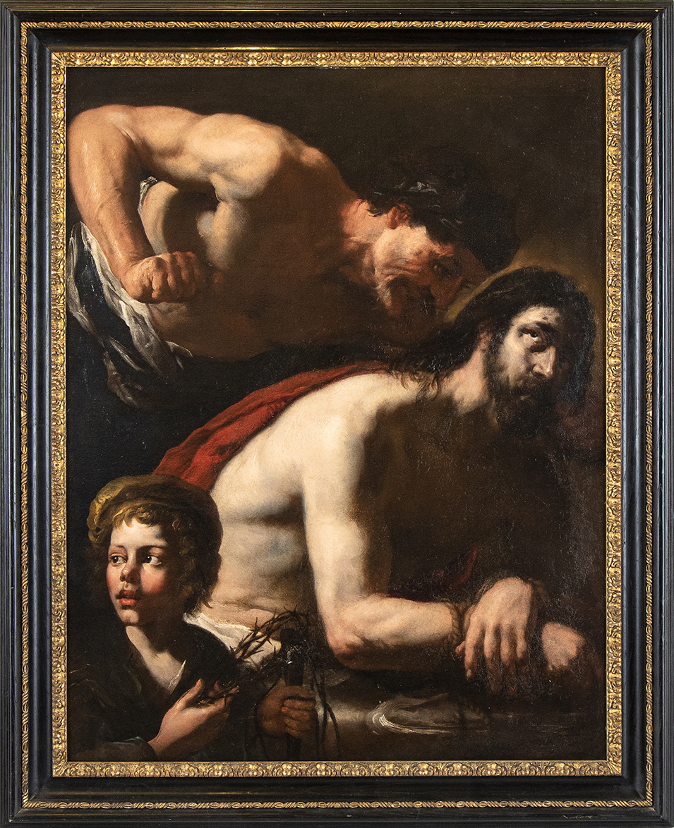 Questo dipinto impressionante, sicuro autografo di Orazio De Ferrari, fornisce una rappresentazione potente del tema dell’Ecce Homo, originale già nell’impostazione della scena: Cristo, infatti, è qui raffigurato seduto e ripiegato verso il basso, con espressione dolorosamente consapevole e rassegnata, gli occhi rivolti in alto, come a rivolgersi mestamente a Dio padre. Alle sue spalle, un personaggio maschile a torso nudo sembra prendersi provocatoriamente gioco di lui. Il pugno serrato, i muscoli gonfi e le vene rilevate dell’avambraccio danno l’impressione che sia sul punto di battere con violenza il corpo rilasciato di Cristo. Ma l’invenzione più sconcertante e personale è certamente il fanciullo col berretto e i capelli dorati, inabissato nel primo piano, che tiene nelle sue mani la corona di spine e altri arnesi della passione e con sguardo al contempo stupito, incosciente e distaccato, catalizza e guida l’attenzione del riguardante sulla tragicità e crudeltà di quanto sta accadendo.