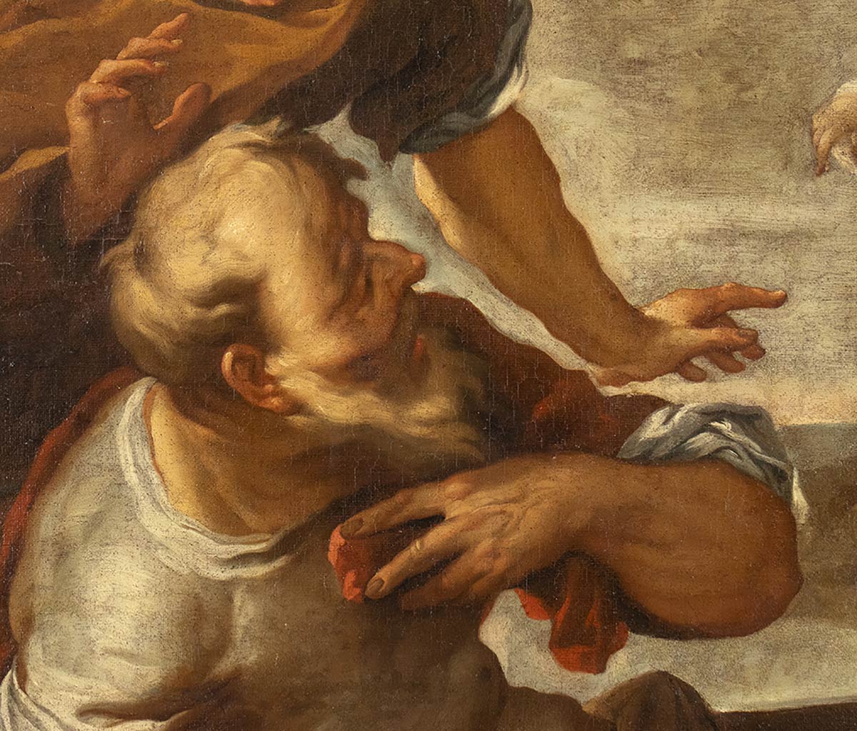 L'opera costituisce l'unica replica fin'ora conosciuta del dipinto (cm. 159x124) ubicato nel passaggio alla Cappella del Tesoro nella Certosa di San Martino, a pendant della Vocazione di San Matteo, eseguito nel 1659-60 (O.Ferrari, G.Scavizzi, Luca Giordano. L'opera completa, Electa, 2000, Vol.I, p.260, Cat.A65. Vol.II, Tav.VIII, fig.142). In collezione privata a Londra è conservato il disegno preparatorio ad acquerello con tocchi di gesso rossi (Ibidem, Vol.I, p.106, Cat.D036; AA.VV., Luca Giordano 1634-1705, Electa, 2001, Cat.16).