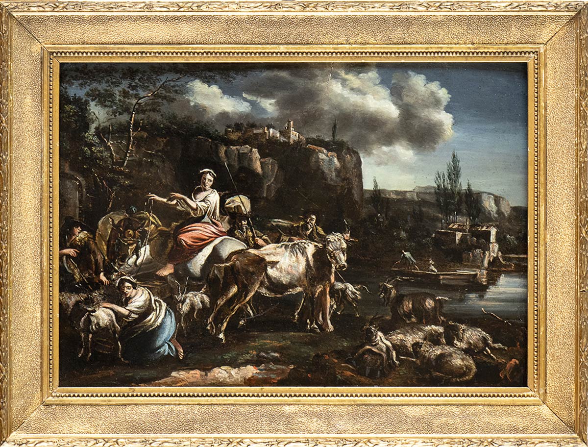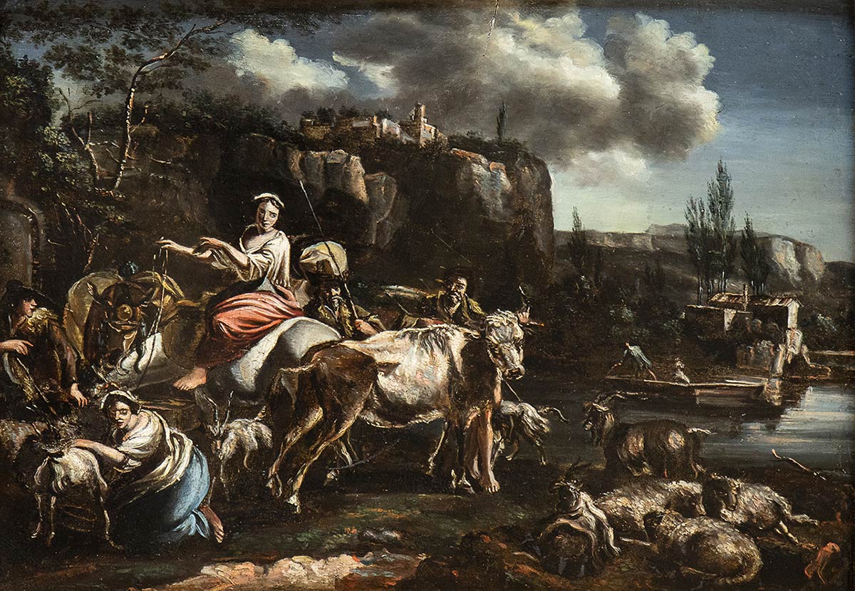 Paesaggio con pastori e armenti presso un corso d'acqua