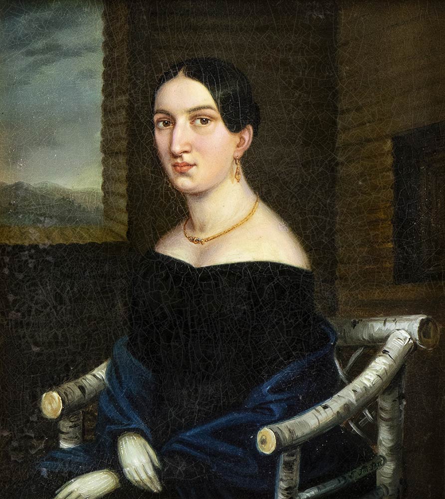 Ritratto di gentildonna su sedia rustica nel casino di caccia