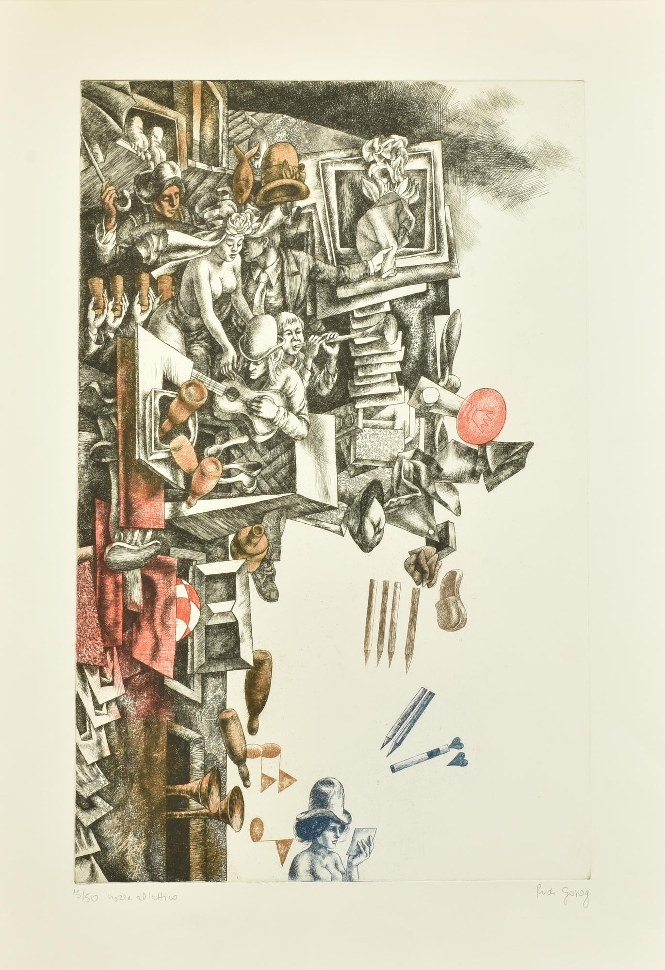 Rudi Gorog NOZZE AL'ATTICO incisione su carta Fabriano, battuta cm 56x35, su...