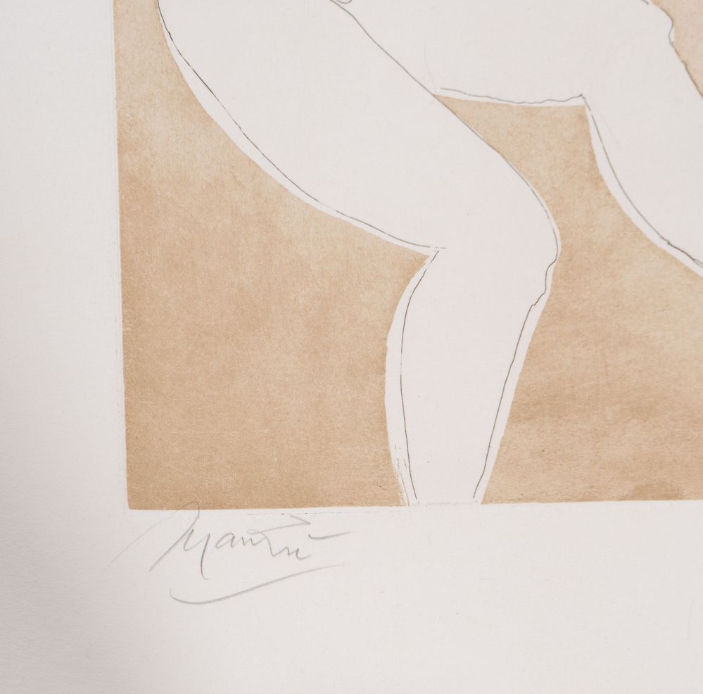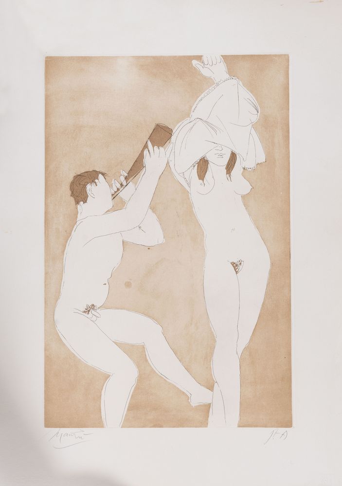 GIACOMO MANZÙ (Bergamo 1908 - Roma 1991) "Flautista con modella". Acquaforte e acquatinta su carta. Foglio: cm 70,5x49,5; lastra: cm 51x33,5. Opera firmata in basso a sinistra Manzù. Reca numeri di tiratura in basso a destra P.A. Reca timbro in basso a destra Alberto Caprini Stampatore, Roma. Opera accompagnata da certificato di autenticità a firma Alberto Caprini.