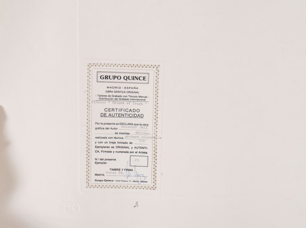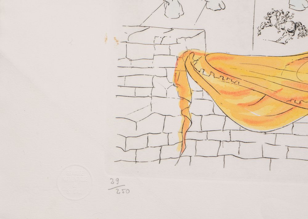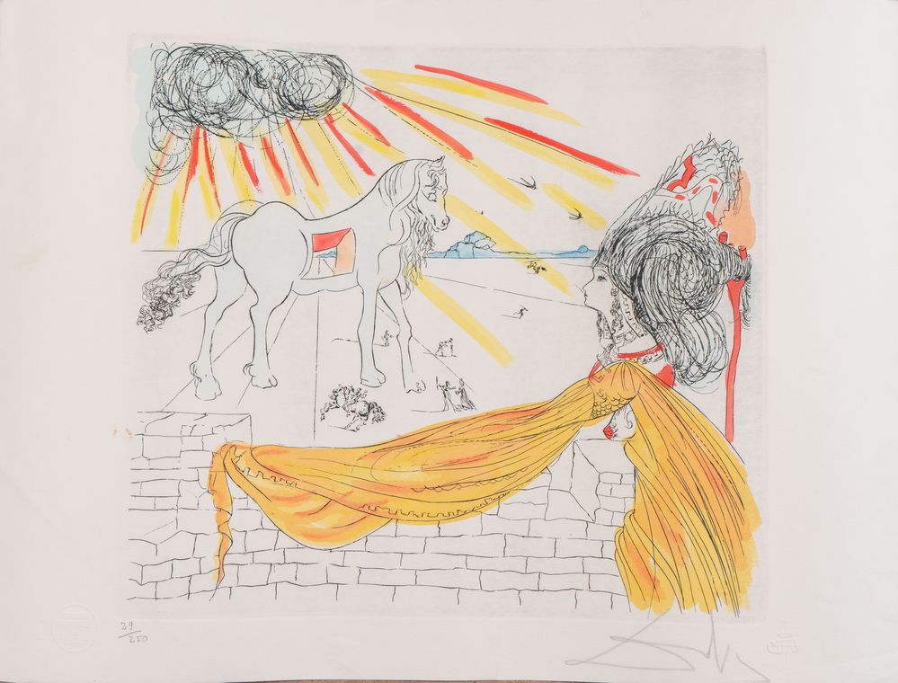 SALVADOR DALÍ (Figueres 1904 - 1989) "Helen and the Trojan horse". Litografia acquerellata a colori su carta. Foglio: cm 55,5x75; lastra: cm 46,5x51.5. Opera firmata in basso a destra Dalì. Reca numeri di tiratura in basso a sinistra 29/250. Reca timbro in basso a sinistra Gravure Authentique de S. Dalì. Reca timbro in basso a destra. Al retro reca etichetta di autenticità del Grupo Quince, Madrid.