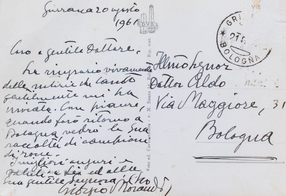 GIORGIO MORANDI (Bologna 1890 - 1964) Cartolina postale viaggiata, con località Grizzana. Cm 10,5x15. Cartolina firmata e datata Giorgio Morandi 1961.