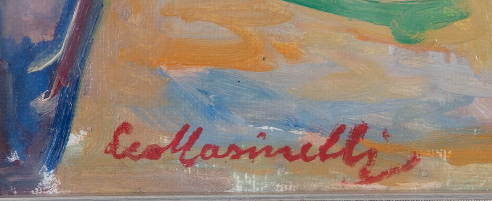 LEO MASINELLI (Modena 1902 - Venezia 1983) "Natura morta", 1970. Olio su faesite. Cm 46x64,5. Opera firmata in basso a sinistra Leo Masinelli. Al retro opera datata 9-4-1970.