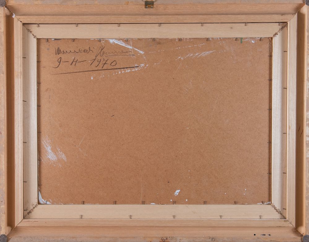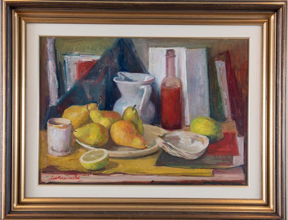 LEO MASINELLI (Modena 1902 - Venezia 1983), "Natura morta", 1969. Olio su faesite. Cm 63x43. Opera firmata in basso a sinistra Leo Masinelli. Al retro reca dedica in data marzo 1969.