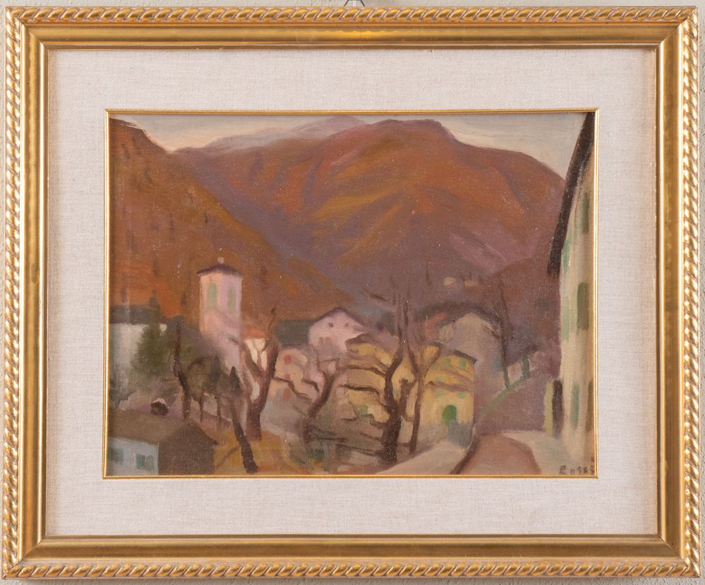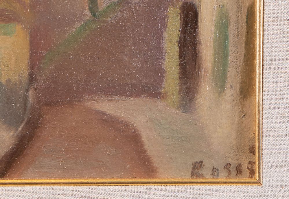ILARIO ROSSI (Bologna 1911 - 1994) "Paesaggio con case". Olio su cartone intelato. Cm 30x40. Opera firmata in basso a destra Rossi.