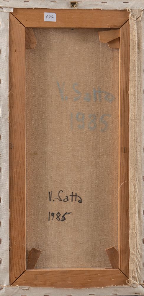 VINCENZO SATTA (Nuoro 1937) "Senza titolo", 1985. Olio su tela. Cm 60x30. Al retro opera firmata e datata V. Satta 1985.