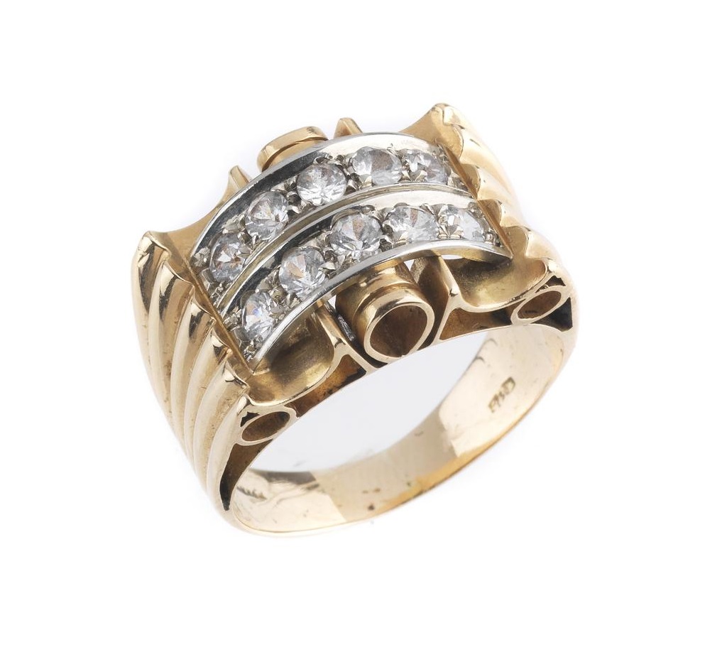 ANELLO IN ORO GIALLO E DIAMANTI SINTETICI, ANNI '40