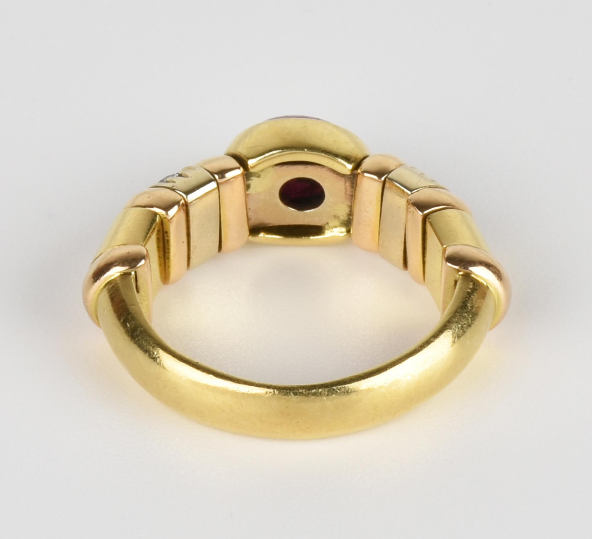 in oro giallo 18kt, con corindone rosso varieta' rubino taglio cabochon e quattro piccoli diamanti di contorno.