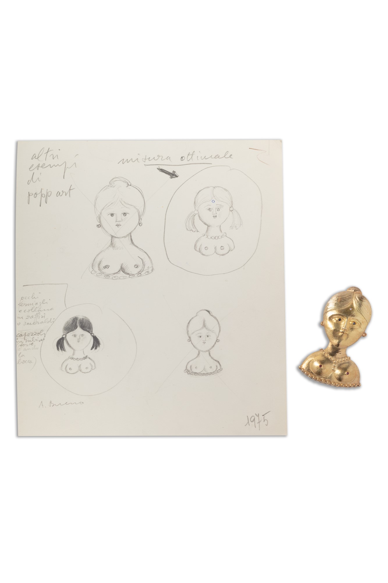 L'opera è accompagnata dal disegno preparatorio eseguito a grafite su carta, con descrizioni autografe per la realizzazione, firmato in basso a destra: A.Bueno, datato in basso a destra: 1975, e recante al verso il timbro del Museo Torrini, Firenze