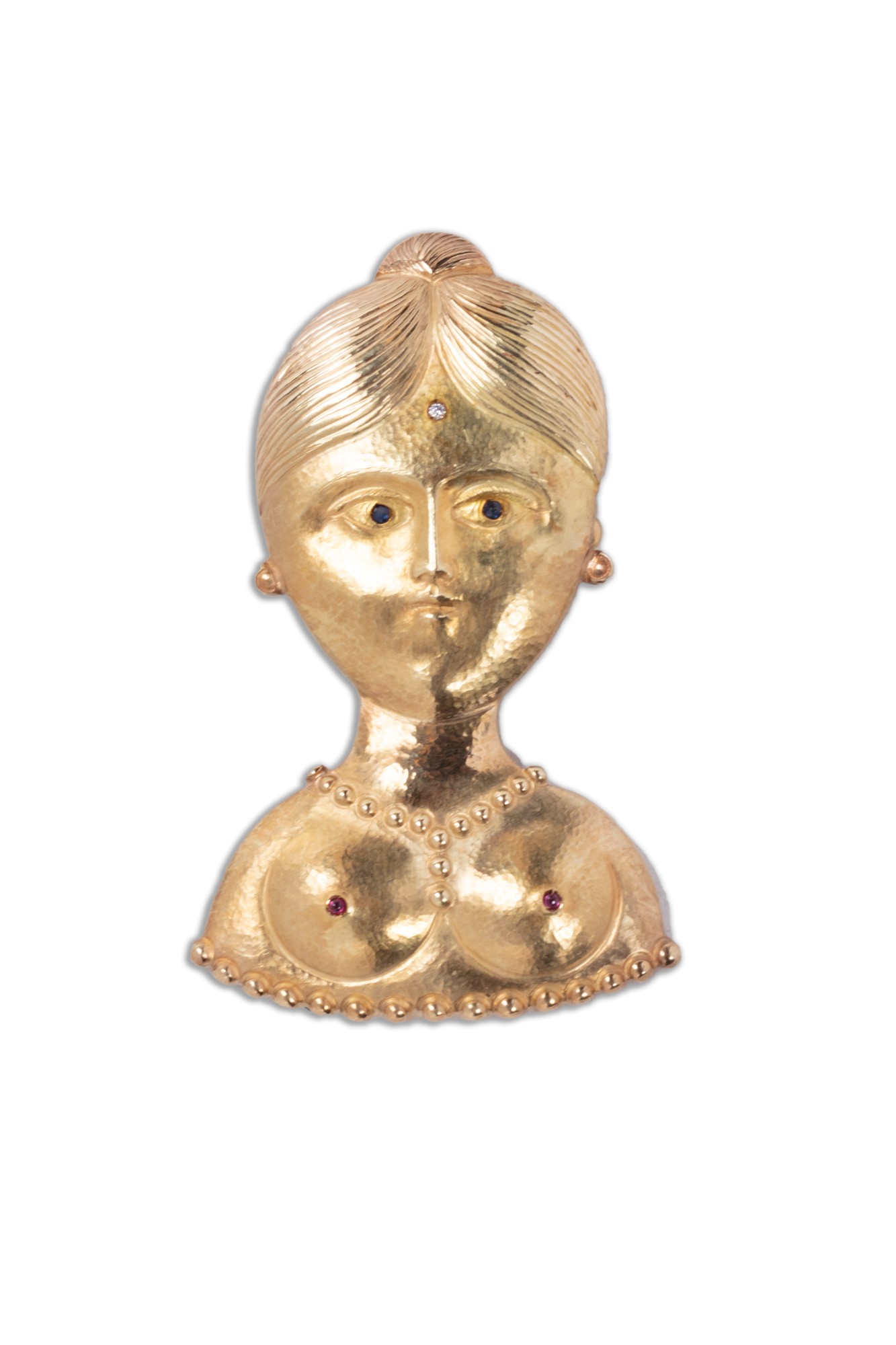 spilla in oro giallo 18 ct con rubini, zaffiri e diamante, esemplare unico cm 7x4 gr 19,6