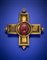 Yellow gold greek cross pendant/brooch with a center scarab carnelian intaglio, relief inscription "ROMA," g 36.00 circa, length cm 8.70 circa. Incomplete hallmarks. (slight defects)