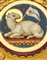 Spilla rotonda in oro giallo con la scritta "ECCE AGNUS DEI" tra volute e cordoncini lavorati a fune, al centro un micromosaico su base in resina ocra e trasparente per l'aureola, g 26,88 circa, diam. cm 5,30 circa.