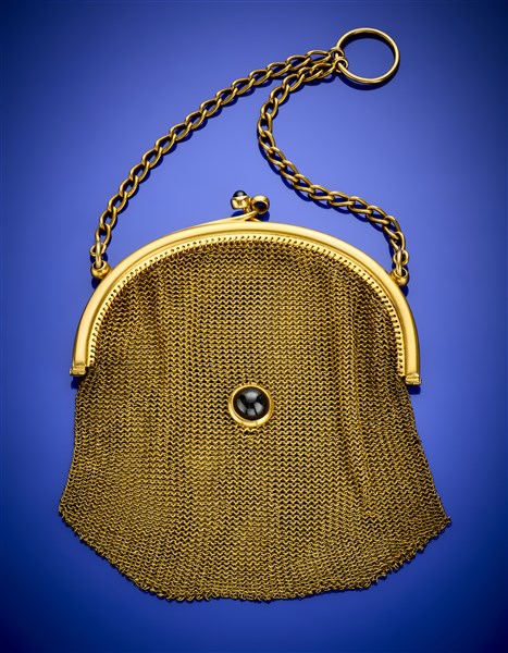 Borsina da sera a rete in oro giallo con catena di cm 24 circa e rifinita con due zaffiri cabochon sulla chiusura e uno avvitato sulla rete, lo zaffiro principale di ct. 9,30 circa, g 152,84 circa, lungh. cm 14,30 circa. (lievi difetti)