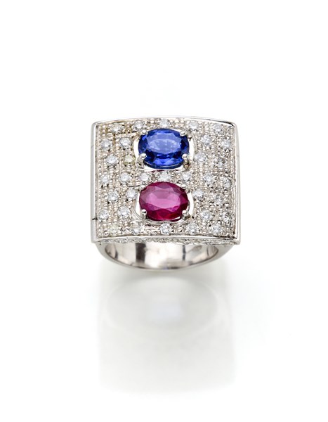 Lot 534 | Anello in oro bianco con rubino e zaffiro ovali per complessivi ct. 2,25 circa