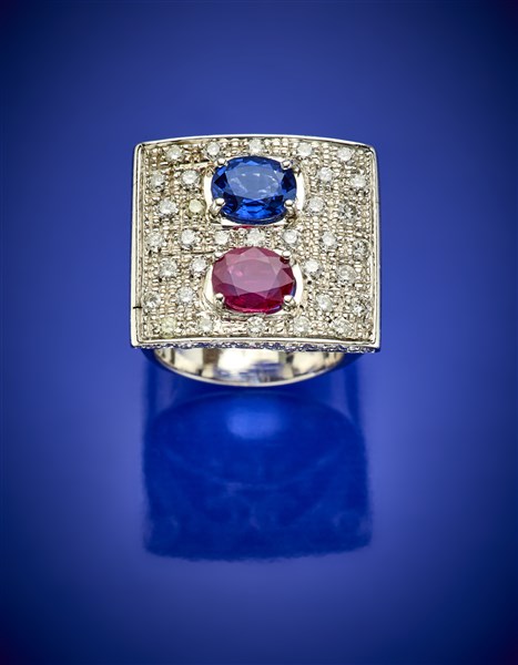 Anello in oro bianco con rubino e zaffiro ovali per complessivi ct. 2,25 circa rifinito in diamanti per complessivi ct. 1,10 circa, g 14,51 circa misura 8/48. (mancanze)
