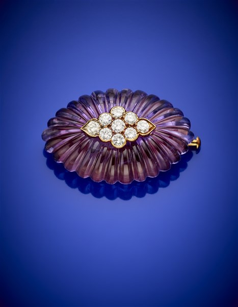 Broche ovale in oro giallo, ametista scolpita e diamanti rotondi, g 17,42 circa, lungh. cm 3,50 circa. Reca marchio VCA e n° inventario.