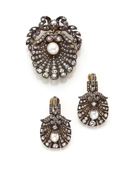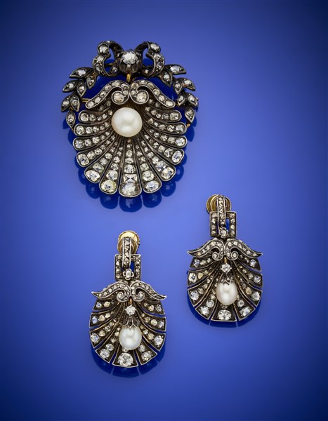 Demi-parure in oro e argento a conchiglia stilizzata con diamanti old mine, mezza rosetta e perle, composta da una spilla di cm 4,3 circa e orecchini pendenti di cm 3,2 circa , complessivi g 33,97 circa.
