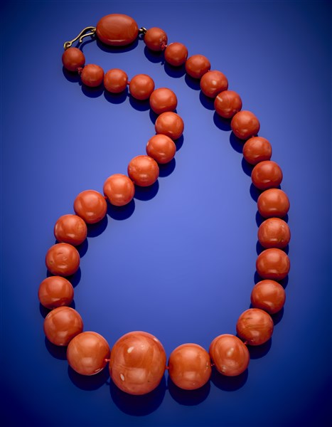 Collana a scalare a boule di corallo arancione da mm 9.50 a mm 35.00 circa, chi