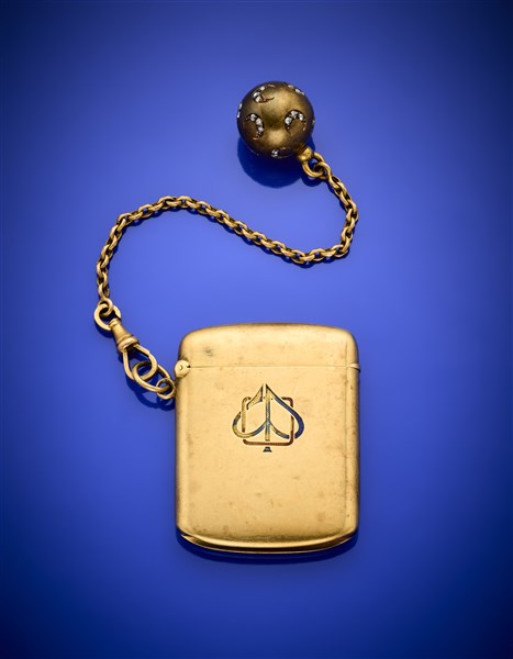 Lot 613 | Porta carnet in oro giallo con catena di cm 13,4 circa e pendente a boule con l