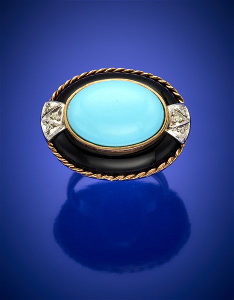 Lot 625 | Anello in oro giallo, onice e turchese cabochon rifinito con piccoli diamanti,