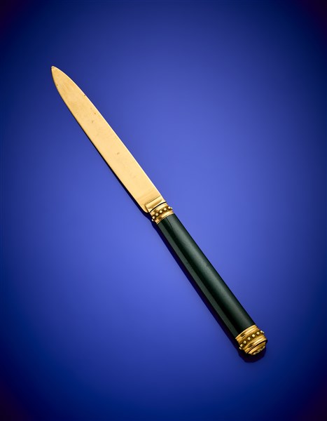 Tagliacarte in oro giallo con manico in bachelite, g 31,75 circa, lungh. cm 19,50 circa. (difetti)