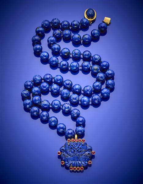 Collana in boule di lapislazzuli di mm 12,30 circa con pendente in lapislazzuli scolpito e rubini, dettagli e chiusura in oro giallo, g 209,03 circa, lungh. cm 88 circa. (lievi difetti)