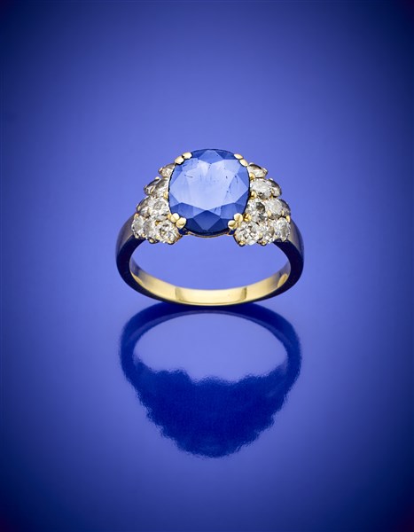 Anello in oro giallo con zaffiro ovale di ct. 3,20 circa, con ai lati diamanti