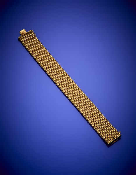 Bracciale a maglia intrecciata in oro giallo, g 40,84 circa, lungh. cm 19,20 circa. Firmato e marcato Uno.A.R., 1 AR.