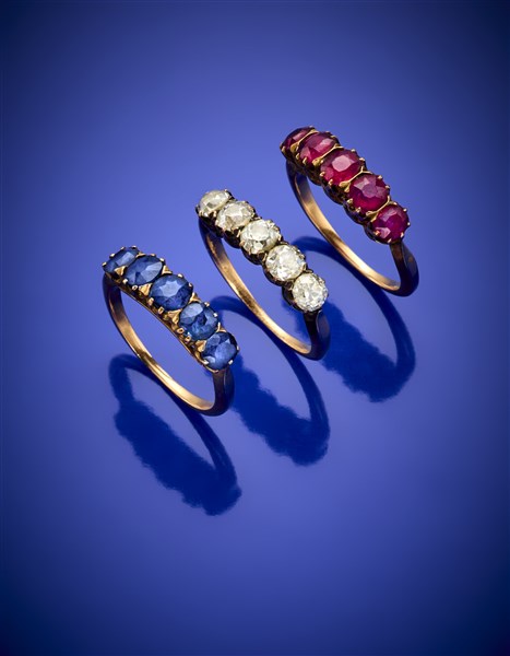 Lotto di tre anelli in oro giallo, diamanti old mine, rubini e zaffiri, complessivi g 8,16 circa misura 12/52.