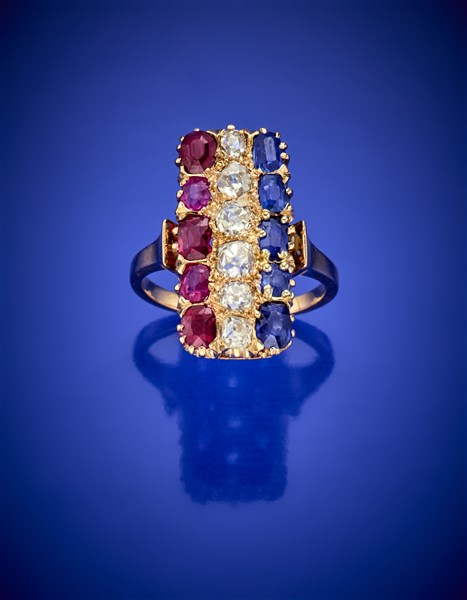 Anello in oro giallo di forma rettangolare con diamanti old mine, rubini e zaffiri, g 5,36 circa misura 13/53. (lievi difetti)