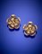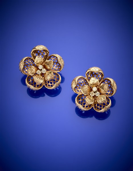 Orecchini traforati a fiore in oro rosso 500/1000 e diamanti, g 18,07 circa, di