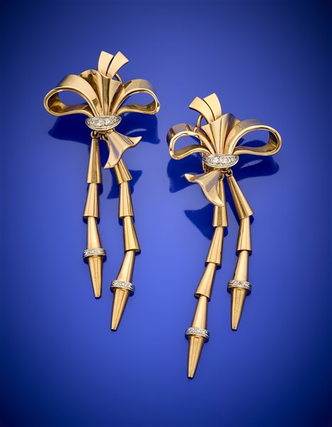 Lot 650 | Orecchini a fiocco in oro giallo e bianco rifiniti in diamanti a tenere due pen