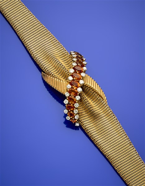 Lot 664 | Bracciale morbido a fascia in oro giallo rifinito con diamanti e quarzi citrini