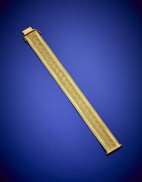 Bracciale a fascia morbida in oro giallo, g 50,00 circa, lungh. cm 19,10 circa. Marcato 78 VI.